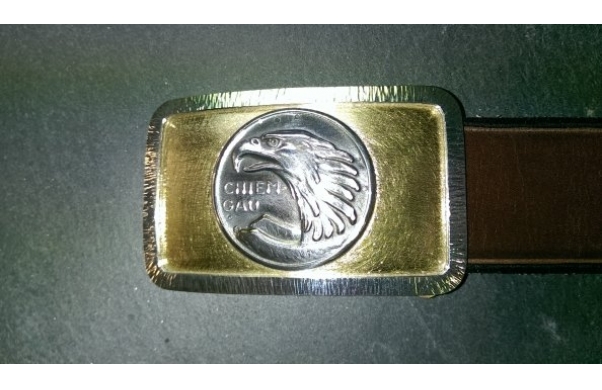 Rechteckige Schließe mit dem Chiemgau Adler in 925 Silber sowie der gehämmerte Schließenrand in Silber,der Korpus aus Messing, die Größe der Schließe 8 cm breit und 5 cm hoch.Der Gürtel aus