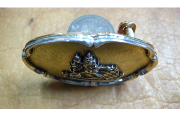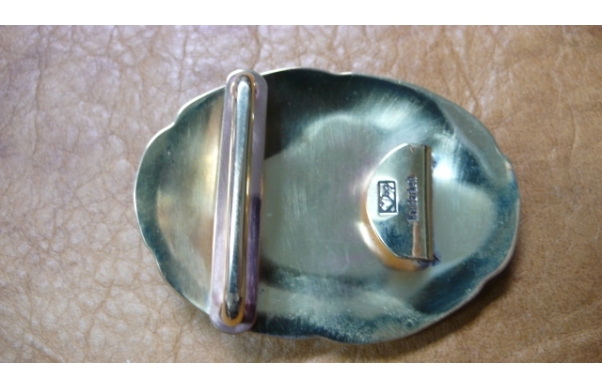 Die kleine Gürtelschließe mit barockem Schließenrand und bairischen Löwen mit Schild in Sterlingsilber, der Korpus in Messing. Der Gürtel aus