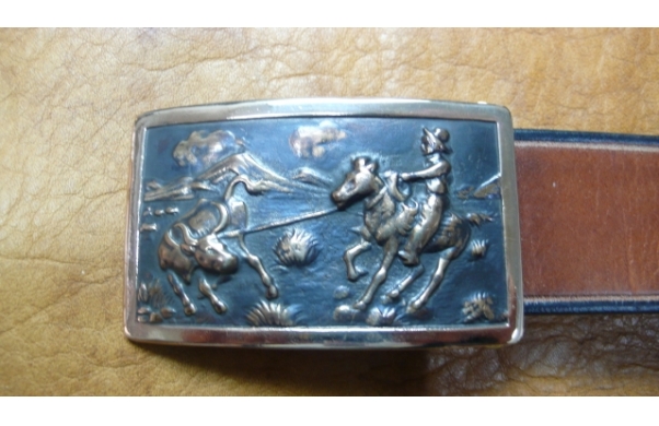 Die Gürtelschließe ist aus massivem Messing.Sie stellt einen Cowboy bei der Arbeit dar. Der Gürtel aus