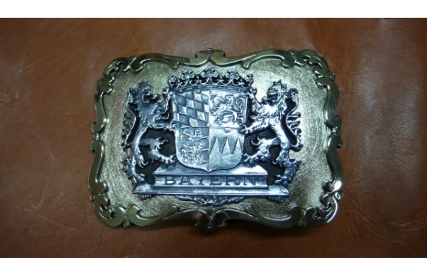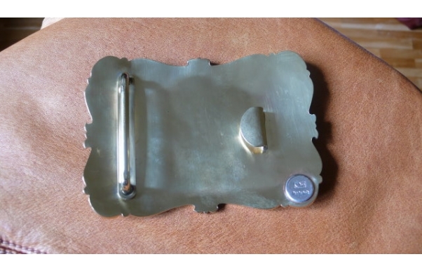 Die Schnalle ist ganz aus Messing und eisgekratzt mit aufwändigem Schnallenrand und Wappen. Der Gürtel aus