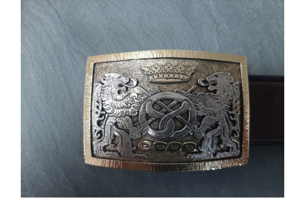 Eine Schließe in Bicolor, der Schließenrand gehämmert in Messing, das Wappen in Silber!Der Gürtel ist natürlich stufenlos größenverstellbar. Benötigt aber hierbei keine Löcher!