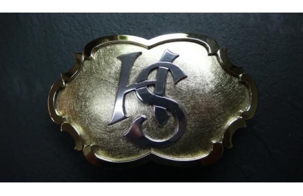 Trachtige Monogrammschließe in bicolor, der Korpus wurde eisgekratzt besteht aus Messing sowie der Schließenrand,die Monogramme in Sterlingsilber! Der Gürtel aus