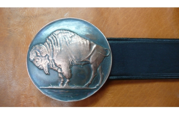 Westernschnalle Bison, rund mit einem Durchmesser von 75mm Die Schließe ist aus Bronze Der Gürtel aus