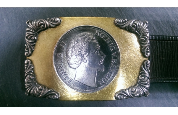 Eine Gürtelschließe in Silber und Messing, von mir entworfen und gefertigt, die Maße 9,5 cm mal 6 cm, die Ecken der Schließe sind Massiv Silber sowie der Taler mit König Ludwig 2 der Korpus aus Messing wurde eisgekratzt. Der Gürtel aus