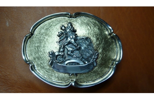 Die kleine Gürtelschließe mit barockem Schließenrand und bairischen Löwen mit Schild in Sterlingsilber, der Korpus in Messing. Der Gürtel aus